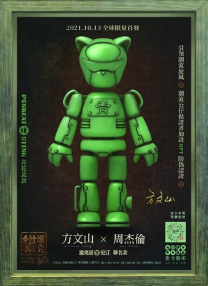 10月13日,一款名为《庞克猫史汀》(青花瓷款)的潮流公仔吸引了多方的注意,不仅是因为该产品在当日进行全球限量首发,更与其一直以来以“方文山、周杰伦联名款公仔”进行宣传密不可分。