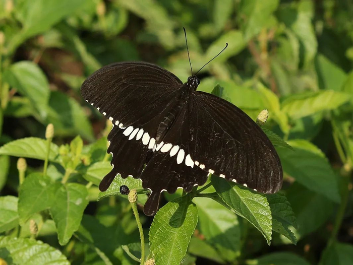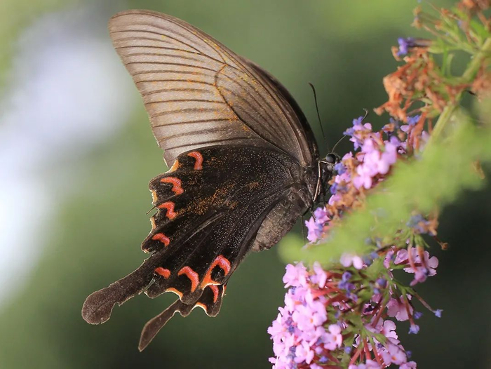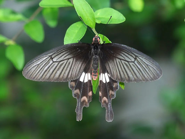 碧凤蝶是上海地区体型最大的蝴蝶之一,翅膀黑色,翅背面散布有蓝色和绿色的鳞片,后翅腹面具有粉红色新月形斑纹。飞行迅速,喜欢访花吸蜜。