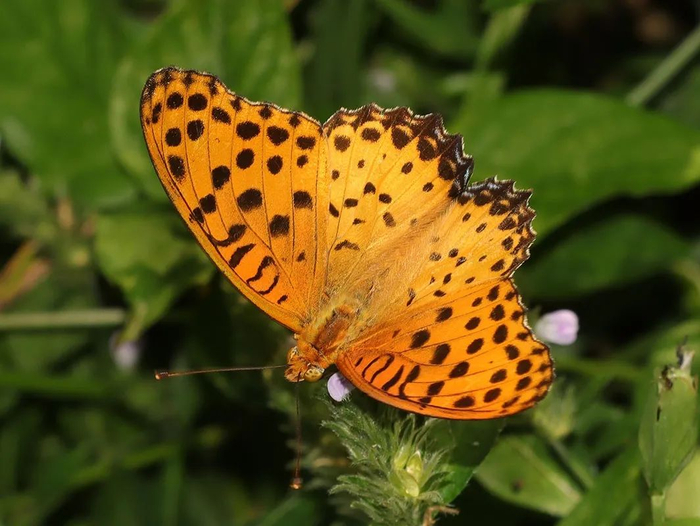 中大型蝴蝶,雄蝶翅膀黄底黑点如同豹纹,雌蝶前翅具蓝斑和白色的斑带。斐豹蛱蝶比较常见,飞行缓慢而优雅,喜欢访花吸蜜,喜欢栖息在城市公园花坛、大草坪上。