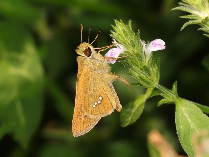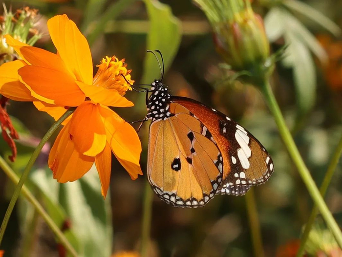 中型蝴蝶,翅膀为橙黄色,前翅顶角处具有白色斑点,后翅有小黑斑。金斑蝶同虎斑蝶一样飞行优雅,喜欢访花吸蜜,也是非常美丽的蝴蝶。城市里部分公园绿地、郊野公园、城郊荒地都有机会见到它们的踪迹。