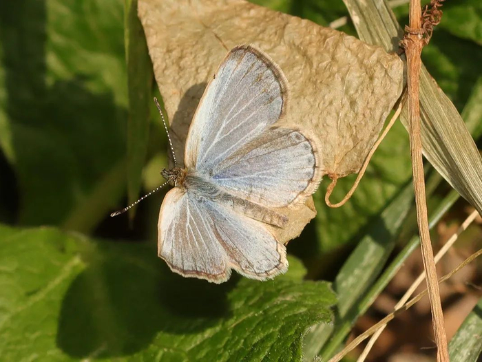 小型蝴蝶,雄蝶翅背面闪金属蓝光泽,而雌蝶基本为黑色,翅腹面淡褐色,黑色或褐色小斑点。酢浆灰蝶是上海地区最常见的小灰蝶之一,喜贴着地面飞,常访花吸蜜或在叶面上晒日光浴。
