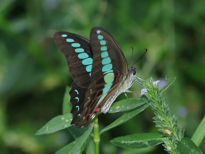 中大型蝴蝶,翅膀较尖,翅黑褐色,具有1列淡绿色的斑带。飞行迅速,喜欢访花吸蜜或在地面吸水。青凤蝶是今年上海秋天数量最多的凤蝶之一,有时候在花坛里能见到数十只青凤蝶一起在采蜜的盛景。