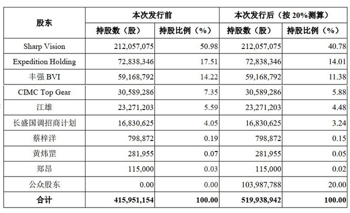 根据招股书(申报稿,下同),本次中集天达拟公开发行股数不超过103987788股(行使超额配售选择权之前),占公司发行后总股本的比例不低于10%,不超过20%(行使超额配售选择权之前)。