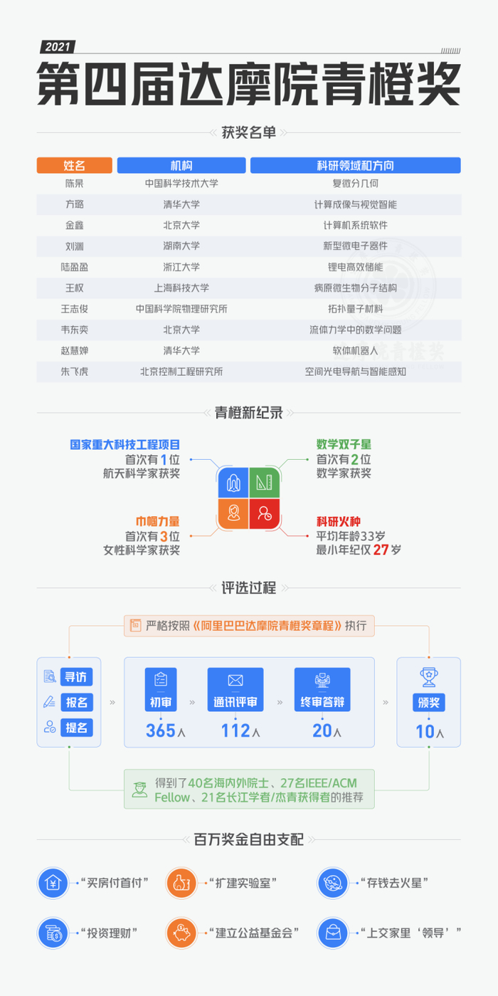 10月14日上午,阿里巴巴达摩院公布第四届青橙奖获奖名单。北京大学韦东奕等10位35岁及以下(U35)的青年学者,将平分1000万元奖金。