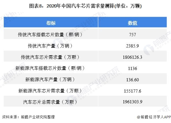 根据2017和2022年的车辆搭配的芯片数量,取两者平均数来测算2020年我国每辆汽车搭载芯片数量,即每辆传统汽车搭载芯片757颗、每辆新能源汽车搭载芯片1136颗。依此估算出2020年我国汽车芯片需求量约为196.13亿颗。