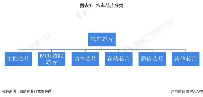 汽车芯片是指用于车体汽车电子控制装置和车载汽车电子控制装置的半导体产品。汽车芯片大致可以分为:主控芯片、MCU功能芯片、功率芯片、存储芯片、通信芯片及其他芯片(传感芯片为主)六大类。