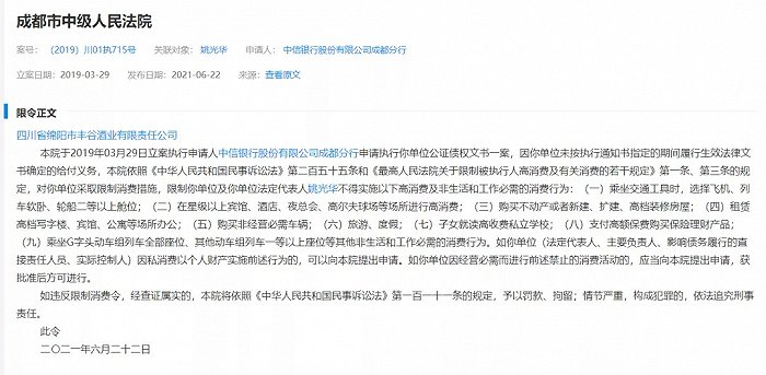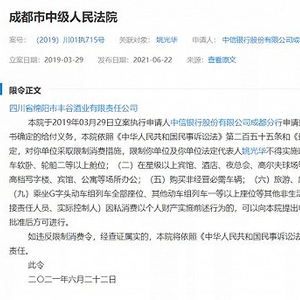 此外,在今年6月,丰谷酒业被中信银行股份有限公司成都分行申请限制高消费。