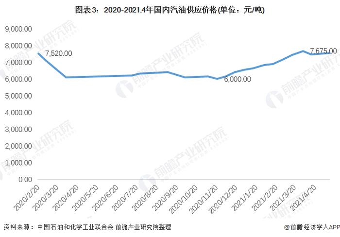 2021年来,随着国内气温不断上升,私家车出行率继续上升,带动国内汽油需求继续上升,加之主营单位对汽油后市看好,因此近期国内主营汽油价格呈现震荡上涨走势,仅仅一周时间主流涨幅在100-300元/吨。截至2021年4月20日,汽油价格为7675元/吨。