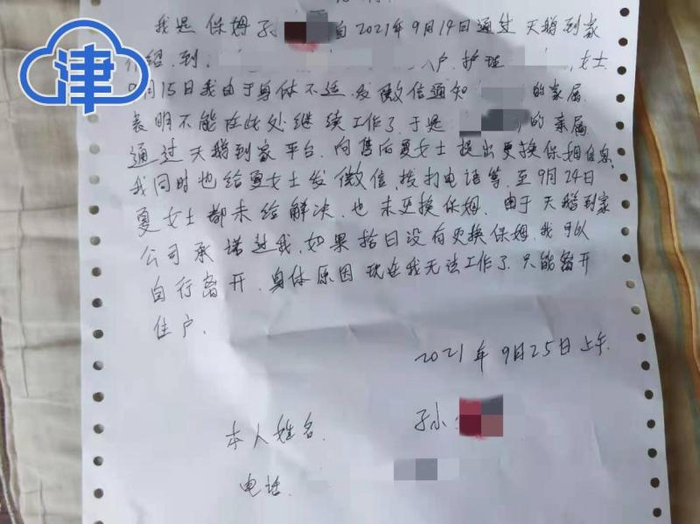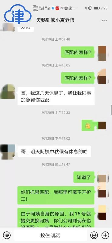 让白先生没想到的是,孙阿姨来了还不到24小时,9月15日就表示“干不了了”,“她说你这亲戚不好照顾,我干不了了。我就赶紧让夏女士为我匹配新的阿姨,但是这次一直没人来。”