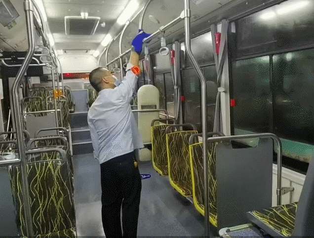 头班车驾驶员郑师傅出发前做例行保洁。 朱倩雯 摄