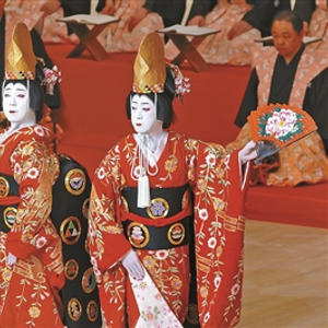 歌舞伎历年扬帆出海的国外公演剧目,必然都要挑选一出纯舞蹈剧上演。原因很简单,在进化完善为真正的戏剧之前,歌舞伎的出发点是17世纪各种世俗流行舞与能戏音乐的大杂烩,后来加入从中国途经琉球传来的三弦乐器,音曲腔调发展愈加丰富。歌与舞是这种舞台表演艺术的四功五法,是艺人学艺过程中最关键的基础课。舞蹈剧的音乐伴奏与伴唱队伍整齐华丽地列于舞台之上,无论是活泼还是哀婉,其乐其声与舞姿紧密配合,而舞蹈身段种种姿态具有指事含义,与唱词互相呼应。介绍歌舞伎的宣传文案均强调其戏服华美,舞台烂漫多彩,艺人舞姿婀娜,舞蹈剧确实能够瞬间展现出歌舞伎的表演特色。