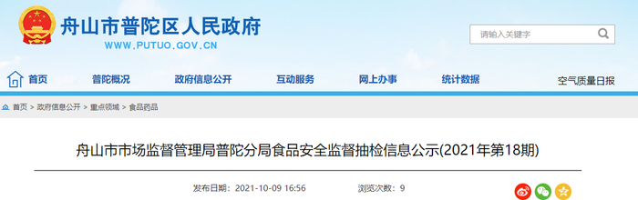 浙江省舟山市市场监督管理局普陀分局食品安全监督抽检信息公示(2021年第18期)