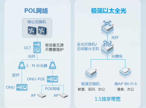 PON(POL)与以太全光网方案对比(摘自《一张图读懂锐捷极简以太全光网》)