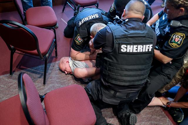 斯考特·史密斯(Scott Smith)被警察按在地上逮捕,他的妻子在人群中高喊,他们的女儿在学校被一个“穿裙子的男生”强奸了。