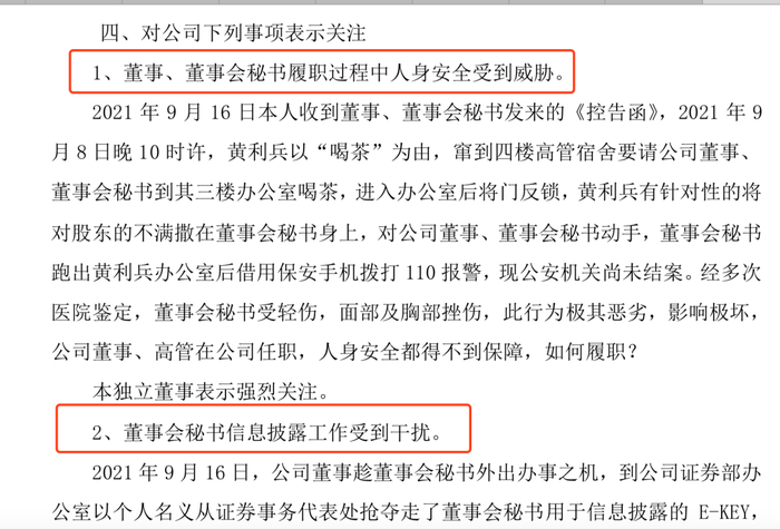 据嘉应制药独立董事肖义南的陈诉,2021年9月16日,肖义南收到公司董事、董事会秘书徐胜利发来的《控告函》,《控告函》称,2021年9月8日晚10时许,黄利兵以“喝茶”为由,窜到四楼高管宿舍邀请公司董事、董事会秘书到其三楼办公室喝茶,进入办公室后将门反锁,黄利兵有针对性的将对股东的不满撒在董事会秘书身上,对公司董事、董事会秘书动手,董事会秘书跑出黄利兵办公室后借用保安手机拨打110报警,现公安机关尚未结案。