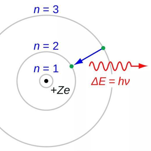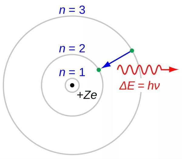 电子从能级n=3跃迁至n=2,释放出特定能量的光,这就是Hα发射谱线。(来源:维基百科)