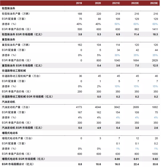 综合上述,我们对后处理配套EGR部件的市场规模进行测算,得到2021E/2022E/2023E的合计市场规模分别为16.0/22.4/33.6亿元。