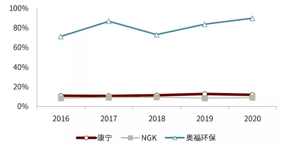 图表:奥福环保、康宁、NGK蜂窝陶瓷相关业务收入占比