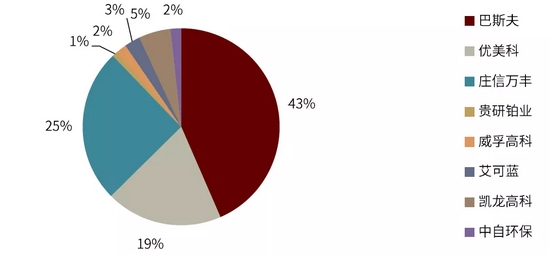 全球及中国的催化剂市场仍由海外品牌主导,国产替代空间广阔。全球主要的污染排放控制催化剂厂商包括德国的巴斯夫、英国的庄信万丰、比利时的优美科、日本的科特拉等。全球环保催化剂市场集中度较高,巴斯夫、庄信万丰和优美科三大巨头占据优势地位,在全球和我国市场份额超过70%。