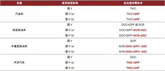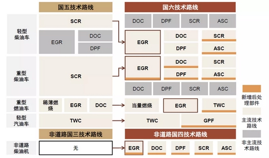图表:国五、国六标准下主流后处理技术路线对比