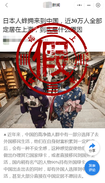 希望自媒体不要再转发炒作类似“30万日本人定居上海”“日本女性在上海比在日本地位高”“上海男人比日本男人好”等内容了,上海虽然包容大气,海纳百川,但决不允许与事实不符的谣传。