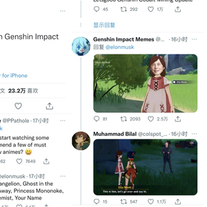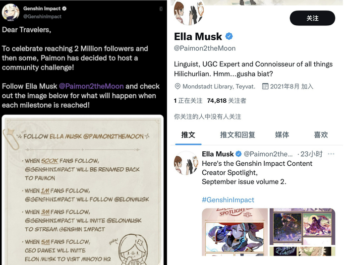 实际上这是米哈游玩的一个梗,《原神》游戏中的确有一位名叫“Ella Musk”的NPC,和Elon Musk只有两个字母之差。而此次活动账号@Paimon2theMoon的昵称正是“Ella Musk”,从简介和内容来看,账号主要负责经营和活跃内容社区,和同人创作者互动。