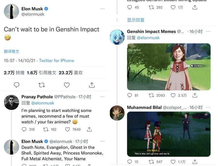 昨日,马斯克(Elon Musk)在推特称:迫不及待进入《原神》的世界了(Can't wait to be in Genshin Impact),引发海内外网友热议。