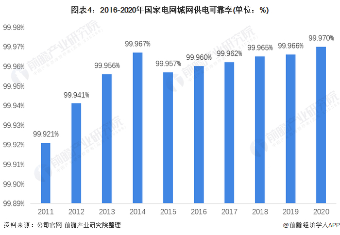 随着我国智能电网建设的逐步完成,电网整体具备了信息双向传递的能力,国家电网借此能够实现电网系统发、输、变、用等全环节、全线路故障的提早发现、提早抢修,随之带来就是我国城网供电可考虑的逐年提升,2020年,我国城网供电可考虑首次达到99.97%。