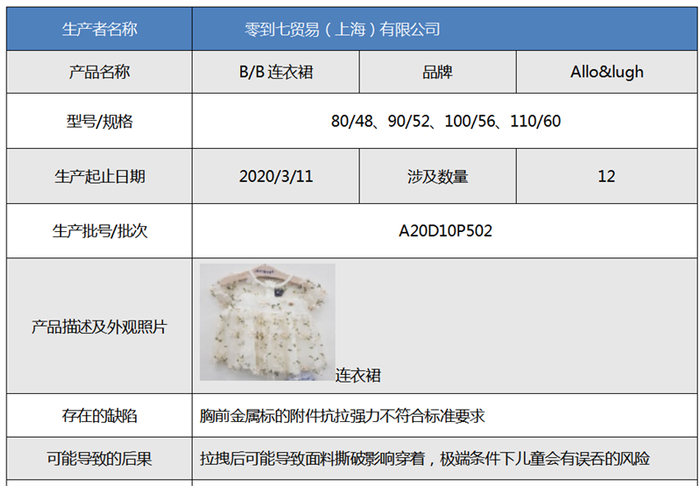 零到七贸易(上海)有限公司将于10月15日起,召回2020年3月11日生产的Allo&lugh B/B连衣裙,生产批号为A20D10P502,共计12件。