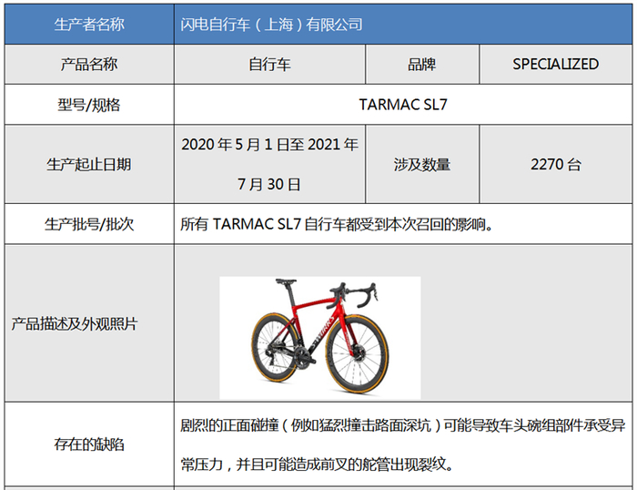 中国网财经10月15日讯(记者 钟文鑫)据上海市市场监督管理局微信公众号“上海市场监管”10月15日消息,闪电自行车(上海)有限公司将于10月15日起,召回2020年5月1日至2021年7月30日期间生产的所有TARMAC SL7自行车,共计2270台。