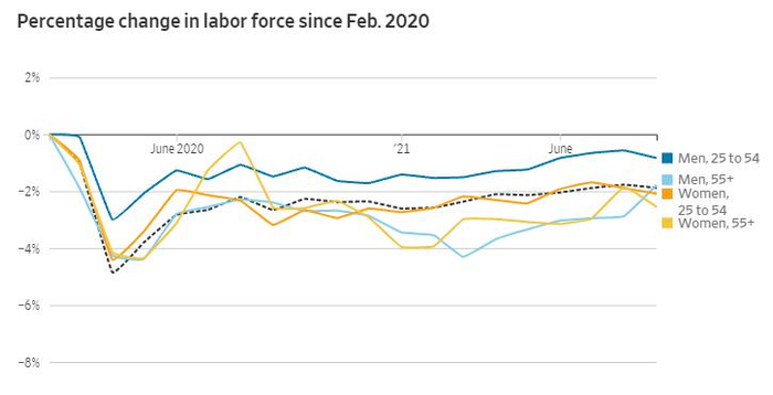 疫情在当下也仍然是就业参与率迟迟难以复苏的一个关键障碍。根据穆迪(Moody ‘s)对美国商务部数据的分析,6月中旬至9月中旬期间,因感染新冠病毒或照顾感染病毒的病人而无法参加工作的人数增加了250万人。