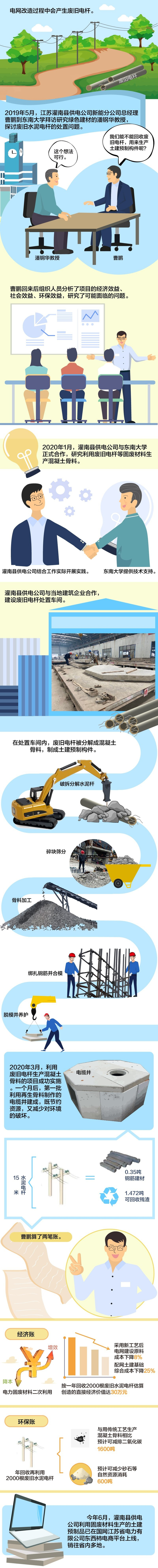 灌南县供电公司制订了废旧电杆等固废材料回收方案,并与当地建筑行业企业合作,共同建设废旧电杆处置车间,打造具有破拆、传送、筛分等功能的综合生产线,利用废旧电杆生产混凝土预制构件。