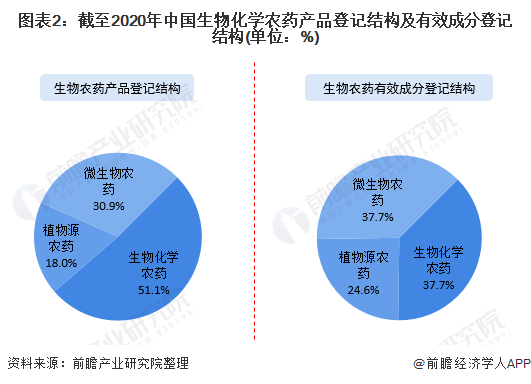 截至2020年,生物化学农药产品登记结构中,生物化学农药、微生物农药以及植物源农药分别占51.1%、30.9%以及18%;生物化学农药产品有效成分登记结构中,生物化学农药、微生物农药以及植物源农药分别占37.7%、30.9%以及18%。由此得出,登记产品中植物源农药的有效成分较高。