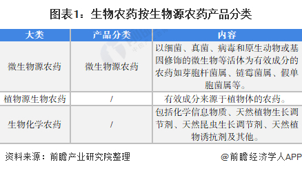 目前,生物农药按生物源的不同分为微生物源农药、植物源农药与生物化学农药。2020年3月19日,农村农业部制定《我国生物农药登记有效成分清单(2020版)》(征求意见稿),其中对于生物化学农药、微生物农药依然沿用老版《规定》,但对于转基因生物由于其可能存在的伦理以及生态风险,不再作为单独的一类生物农药,而是通过基因修饰的微生物类别管理。同理,由于农用抗生素可能导致环境微生物耐药性上升问题,也从新版的生物农药登记目录中暂时移除,以待更进一步的研究商榷。