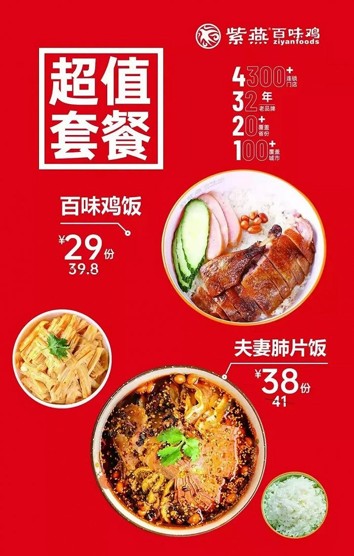 不止于此,紫燕百味鸡又顺利打通外卖渠道,在饿了么和美团上搭配米饭套餐,以解决主食这个关键要素。