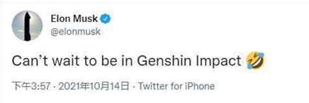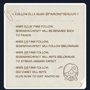 15日,《原神》官方推特@Genshin Impact为庆祝粉丝超过200万人,公布了全新的“社区挑战赛”活动:随着活动账号@Paimon2theMoon的粉丝增加,达成最高成就后(粉丝数量达到500万),米哈游CEO大伟将邀请著名企业家马斯克做客米哈游总部。