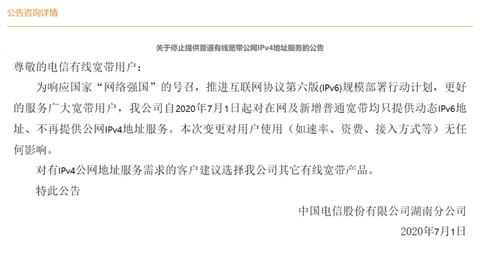 2020年7月1日,中国电信股份有限公司湖南分公司于官网发布公告称,“为响应国家‘网络强国‘的号召,推进互联网协议第六版(IPv6)规模部署行动计划,更好的服务广大宽带用户,我公司自2020年7月1日起对在网及新增普通宽带均只提供动态IPv6地址、不再提供公网IPv4地址服务。本次变更对用户使用(如速率、资费、接入方式等)无任何影响。对有IPv4公网地址服务需求的客户建议选择我公司其它有线宽带产品。”