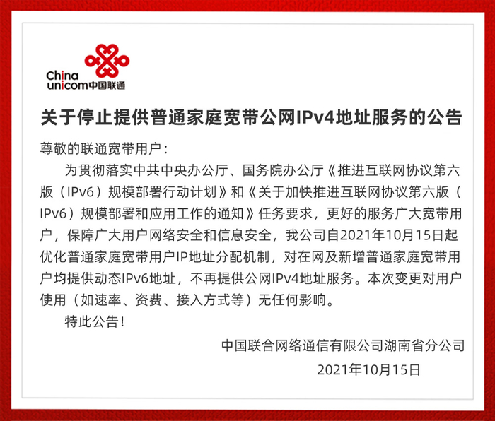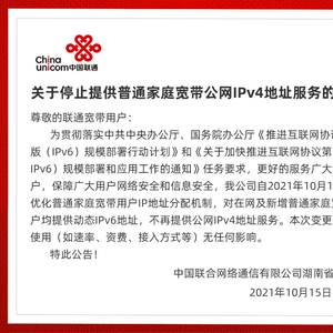 10月15日,中国联合网络通信有限公司湖南省分公司于官网发布《关于停止提供普通家庭宽带公网IPv4地址服务的公告》。