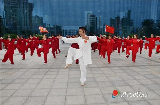 在廉江市文化广场,廉江市武术协会主席陈建龙带领50多名太极拳爱好者进行展演。他们身着统一服装,精神抖擞,队列整齐,动作舒展大方、刚柔并济,一招一式中展示出太极拳的刚柔之美、神韵之美、和谐之美,也充分展现了我市太极拳爱好者热爱生活、积极向上的精神风貌。