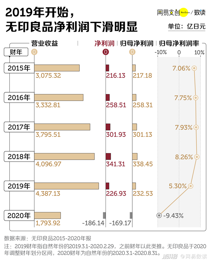 根据无印良品的公开财报,2019 财年,无印良品出现了“增收不增利”的窘况,净利润下滑明显,虽然无印良品 2019 财年营业收益增加 290 亿日元,但净利润下降了近三分之一。
