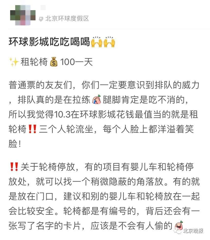 在“小红书”上,一位曾在环球主题公园内靠着租轮椅“妙招儿”获得便利的博主甚至向网友们推荐,“在环球影城花钱最值当的就是租轮椅!三个人轮流坐,每个人脸上都洋溢着笑脸!”