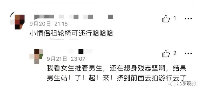 “我看男生坐在轮椅上,女生在后面推着。我还感叹呢,这真是爱情的力量。没想到过了一会儿,男生竟然站起来了,挤到前面拍照去了。”北京晚报(ID:wxbjwb)记者发现,一位网友在“大众点评”上分享了自己在北京环球影城主题公园内看到的奇葩一幕。