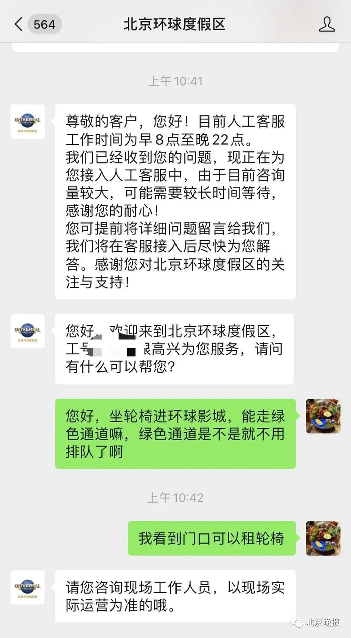 记者通过北京环球度假区微信公众号,向客服人员咨询租赁轮椅可能享受到的绿色通道服务,客服人员表示,“请您咨询现场工作人员,以现场实际运营为准。”