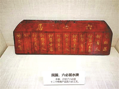 说话间进大门上电梯来到“六必居博物馆”,三层空间,四个展示单元,令人感到面积比想象中大得多。放眼看去,悬挂于大门上方的“六必居”老匾,笔势威风凛凛,堪称镇馆之宝。馆内不仅有发掘的六必居明代老井,还有复原的昔日老店“六必工艺”人物雕塑场景,展柜里陈列着六必居数百年来的账单、照片、功牌、印章、房契、算盘、油灯、酒壶、牌匾及生产制作工器具等近百件藏品,老物件琳琅满目,身临其境更体会到数百年酱园历尽沧桑的创立与发展。