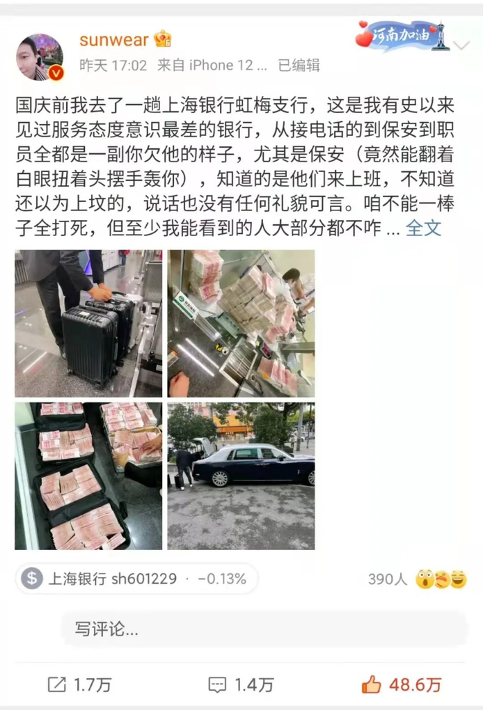 16日,微博认证为信息安全、网络战专家的大V@sunwear发文吐槽称,国庆前去了一趟上海银行虹梅支行,是其有史以来见过服务态度意识最差的银行,从接电话的到保安到职员全都是一副你欠他的样子,说话也没有任何礼貌可言。