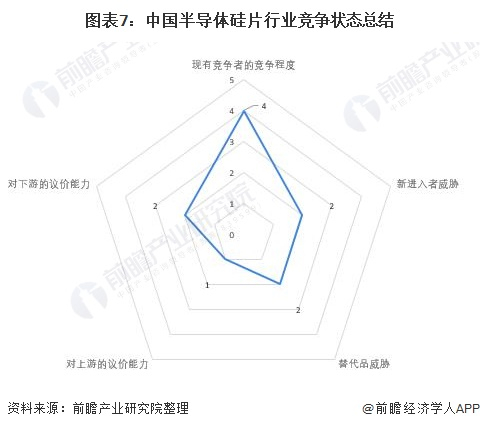 从五力竞争模型角度分析,由于目前,我国半导体硅片市场国内竞争者数量较少,主要竞争者来自全球市场份额较大的日本、德国、韩国、中国台湾等厂商,因此现有竞争者竞争程度较激烈;半导体硅片的技术门槛、认证门槛较高、设备投资较大,具备一定行业壁垒,新进入者威胁程度较弱;半导体硅片是半导体器件关键原材料,替代品威胁较弱;我国对半导体硅片原材料电子级多晶硅的进口依赖性较高,外资原材料供应商对中游半导体硅片生产企业有较强的议价能力,半导体硅片行业对上游的议价能力较低;此外,目前国内半导体硅片厂商主要集中在低端产品领域进行竞争,相较国外厂商而言,对下游的议价能力较低。