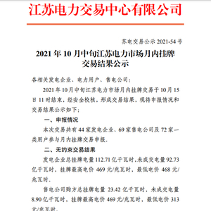 据江苏电力交易中心有限公司公布数据,2021年10月中旬江苏电力市场月内挂牌交易于10月15日11时结束。最终成交294笔,成交电量19.98亿千瓦时,成交均价468.97元/兆瓦时,较基准价上浮了19.94%,接近20%的价格浮动上限。
