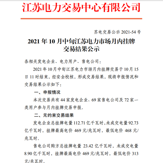 据江苏电力交易中心有限公司公布数据显示,本次交易共有44家发电企业、69家售电公司及72家一类用户参与月内挂牌交易申报。挂牌交易前,江苏电力交易中心有限公司公告称,交易价格浮动幅度范围为上下浮动不超过20%(即浮动范围为:312.8-469.2元/兆瓦时)。也就是说,本次价格涨幅已经接近上限。