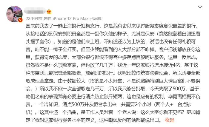 嫌银行服务差,“大V”怒取500万现金