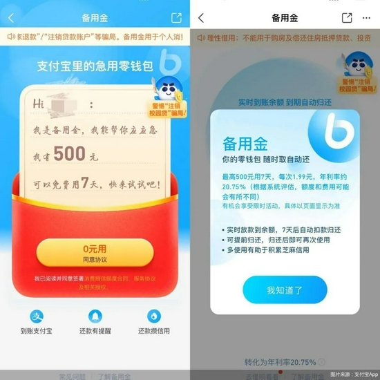 而在诈骗流程中,首先让用户放下防备的是支付宝真实到账500元,这笔钱又是从何而来?事实上,备用金是支付宝推出的一类小额、短期的借款产品,最高额度为500元,借款期限为7天,每次使用收费1.99元,首次使用免费。